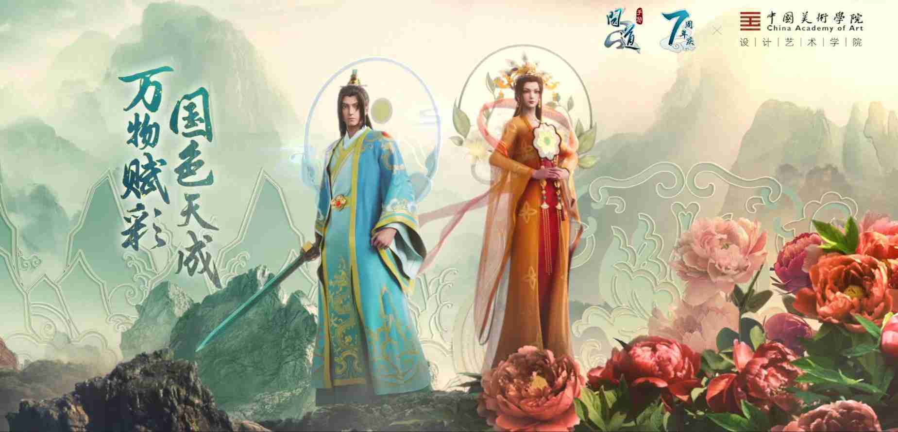 2023年4月,,,,《问道手游》联动中国美术学院,,在游戏中融合了中国历史上不同时期的文化元素,,,,打造了“山河万象”与“凤鸣九霄”的国风时装。。在色彩配置方面,,创作团队基于对游戏角色特性的分析提取相应的文化内涵,,,,从每一种色彩的色相、、、、指代事物和情感出发对应角色属性,,,,选定服装的色彩搭配。。。在纹样设计方面,,创作团队结合游戏角色自身特殊的造型比例和形态,,,,在实际的纹样设计中进行了游戏语境下的活化演绎。。男性角色集中使用了如蟒纹、、海水江崖纹、、如意纹和云气纹等传统纹样元素,,,,女性角色则吸纳了凤凰纹、、、牡丹纹、、、、卷草缠枝纹等元素,,,,组成以“双凤牡丹纹样”“缠枝牡丹纹”“金玉凤冠头饰”为主要纹样的游戏角色装饰图案系统。。